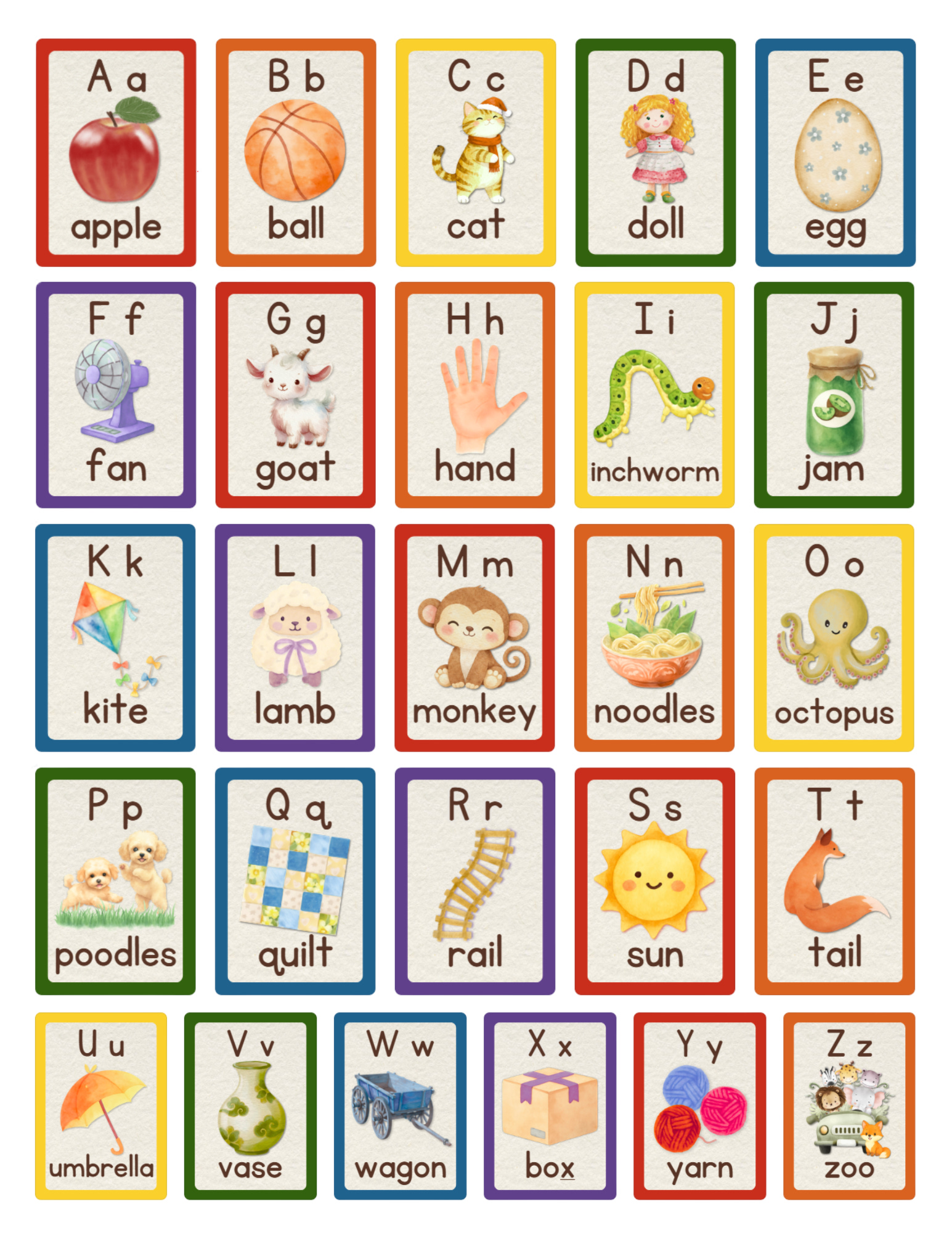 When we learn these sounds, you'll see, Ready to read then we will be. A-a-apple B-b-ball C-c-cat and D-d-doll E-e-egg and F-f-fan G-g-goat and H-h-hand I-i-inchworm J-j-jam K-k-kite and L-l-lamb M-m-monkey N-n-noodles O-o-octopus and P-p-poodles Q-q-quilt and R-r-rail S-s-sun and T-t-tail U-u-umbrella V-v-vase I'm nearly through, See my happy face! W-w-wagon X-x-box Y-y-yarn Say, do you see a fox? See him in the Z-z-zoo It was fun, and now we're through. If we sing this well indeed, Then it's time for us to read!